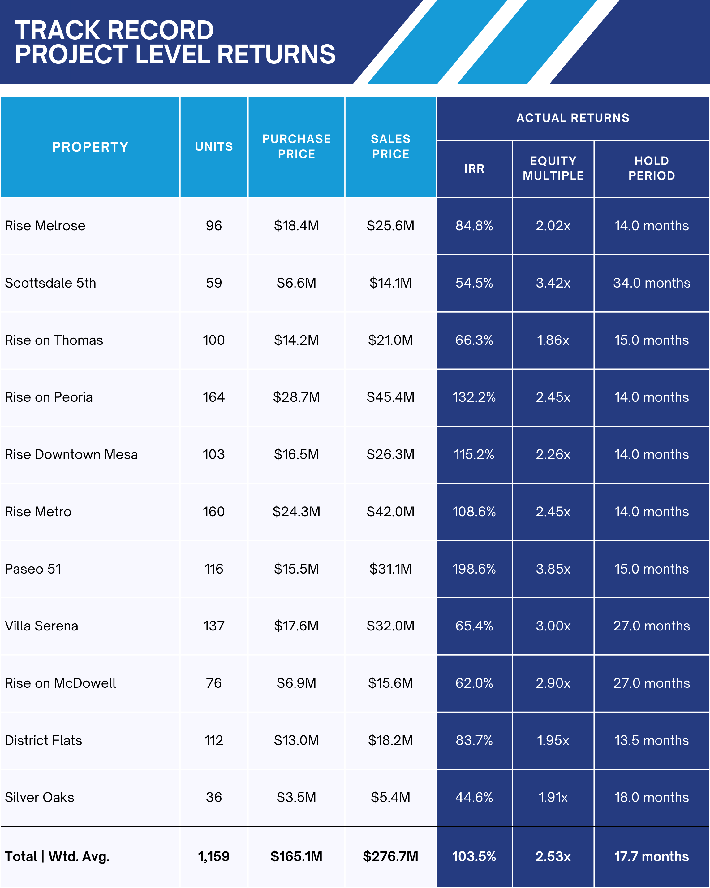 We’ve completed over $2.6 billion in total transactions and purchased over 65 assets, 12,000+ units since 2019. We have completed 11 full-cycle dispositions and returned capital to investors.